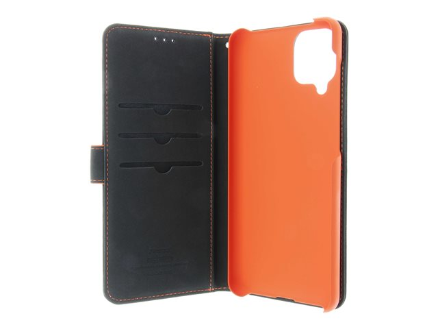 Insmat - Vikbart fodral för mobiltelefon - genuint läder, termoplastisk polyuretan (TPU), polyuretanklädsel - svart, orange, galvaniserad bronsring - för Samsung Galaxy A12