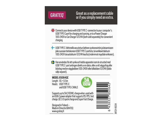 GRATEQ - USB-kabel - USB-C (hane) till USB-C (hane) - AC 100-240 V - 5 A - 50 cm - USB-strömförsörjning (100W) - svart 85064QC