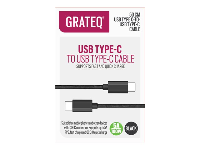 GRATEQ - USB-kabel - USB-C (hane) till USB-C (hane) - AC 100-240 V - 5 A - 50 cm - USB-strömförsörjning (100W) - svart