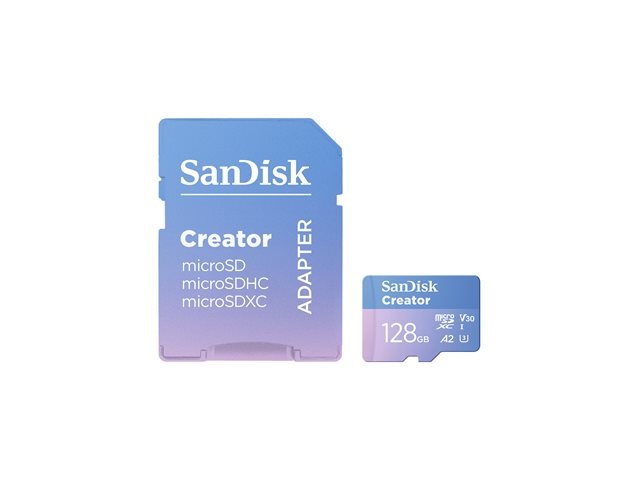 SanDisk Creator - Flash-minneskort (microSDXC till SD-adapter inkluderad) - 128 GB - A2 / Video Class V30 / UHS-I U3 - mikroSDXC UHS-I