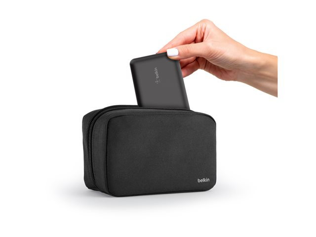 Belkin BoostCharge - Power bank + växelströmsadapter - 10000 mAh - 3 utdatakontakter (USB-C, 2 x USB) - på kabel: USB-C - med fickfodral med dragkedja BU041HQBK