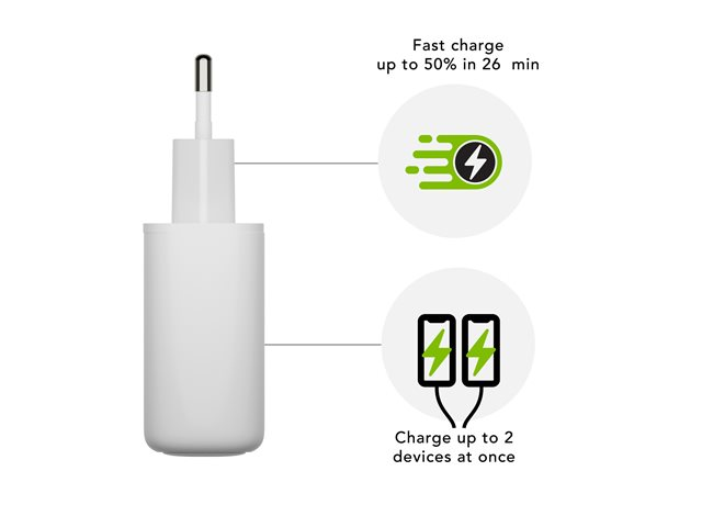 Egenskaper100 % återvinningsbar, kompakt design, energibesparande, GaN Technology, snabbladdning, överhettningsskydd