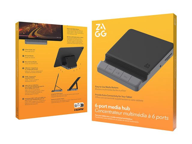 ZAGG-dockningsstationen förbättrar anslutningsmöjligheterna med en mängd funktioner utformade för funktionalitet. Med integrerade USB-C- och HDMI-gränssnitt möjliggör denna dockningsstation smidiga anslutningar till flera enheter, inklusive SD- och microSD-kortläsare för åtkomst till media. Den kompakta designen gör den lämplig för både hem- och kontorsmiljöer, medan det inbyggda vikbara stället erbjuder flexibel placering av dina enheter. Utrustad med tre medieknappar anpassar sig dockningsstationen till olika användningsområden. Den kombinerade hörlurs- och mikrofonutgången förbättrar ljudfunktionerna, vilket gör den idealisk för multimediaapplikationer. USB-C med Power Delivery säkerställer effektiv laddning och dataöverföring, så att alla enheter förblir strömsatta medan de är anslutna.